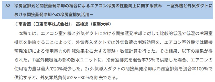 「冷房室排気と間接蒸発冷却の複合によるエアコン冷房の性能向上に関する試み -室外機と外気ダクトにおける間接蒸発冷却への冷房室排気活用-」について